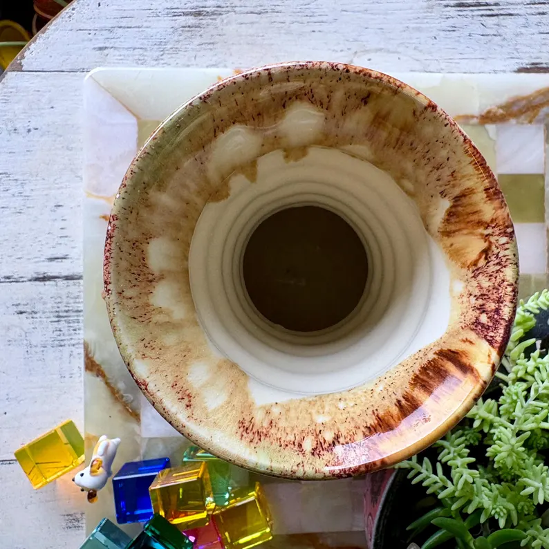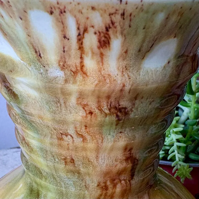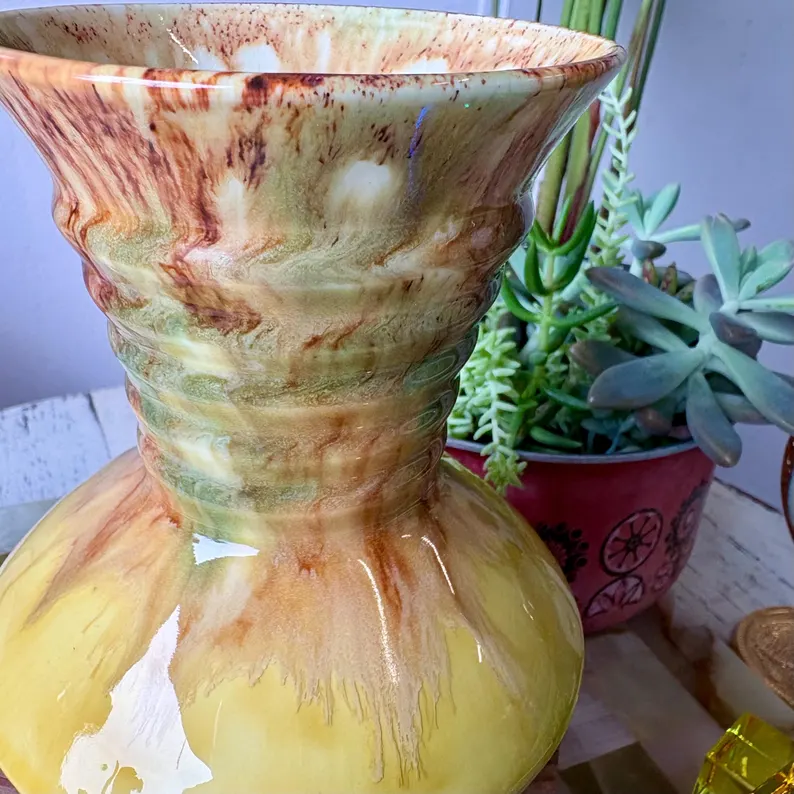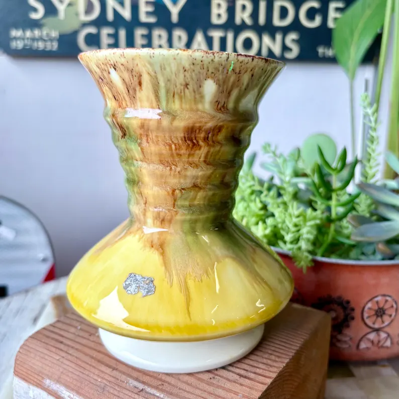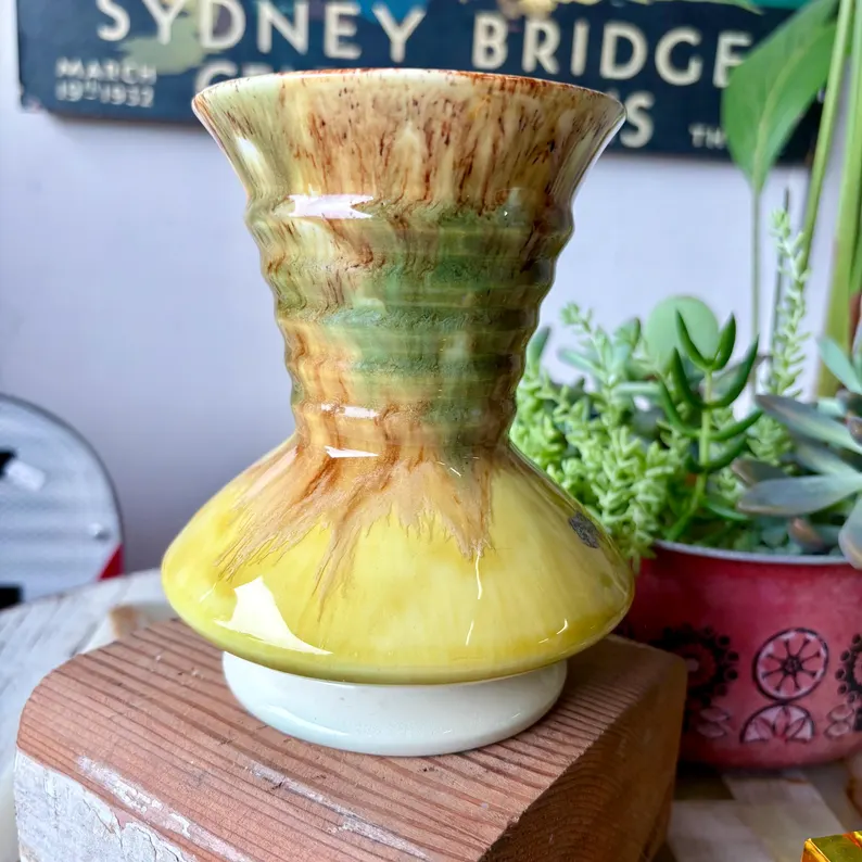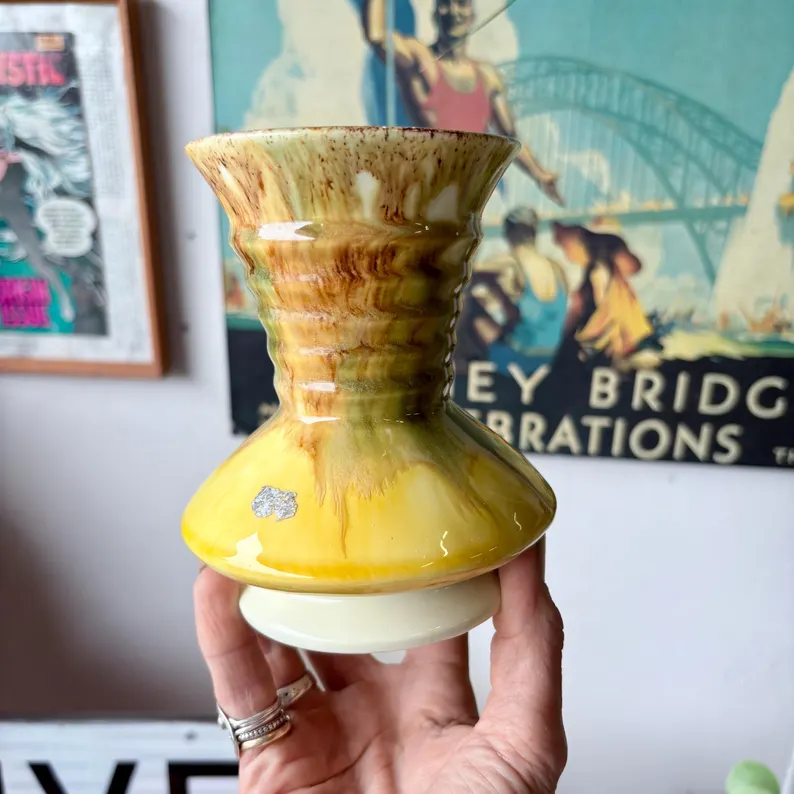 A stunning mid-century floral vase from the 1930s-1950s, featuring a beautifully textured drip glaze finish. This unique ceramic piece is perfect for showcasing your favourite blooms or as a standalone decorative accent on any mantel or shelf.
