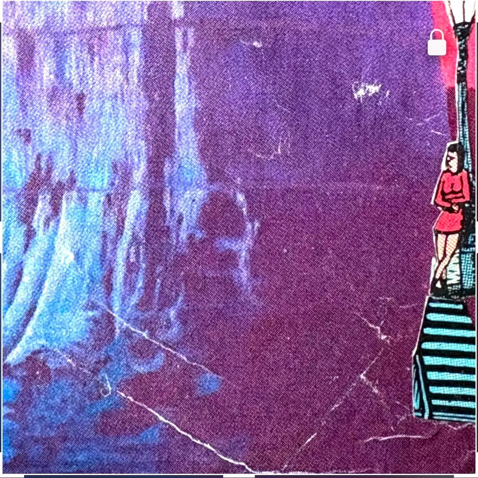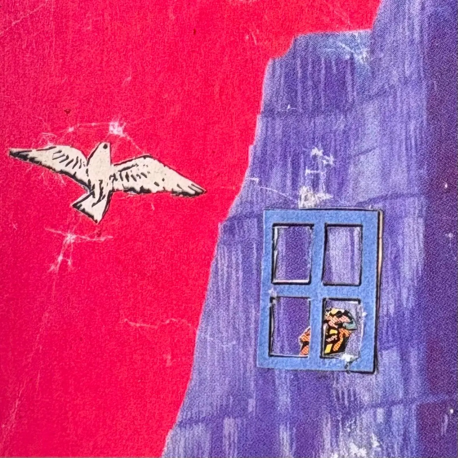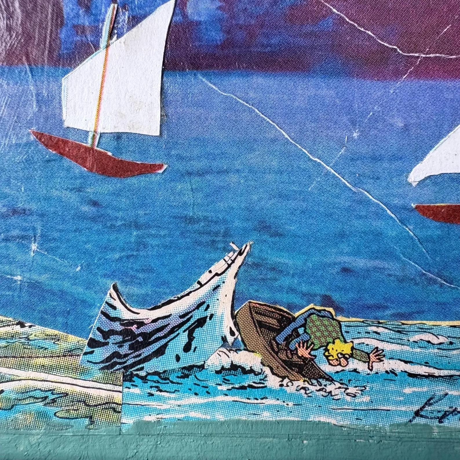 Original mixed media collage by Kim Lawson titled “Back Door Apocalypse / Paranoid Android.” Created using vintage comic and print ephemera on board. The work is framed in a vintage hardwood frame, originally handmade at Blacktown TAFE in 1984, later on it was refinished with Scandinavian oil and fitted with glass and backing. Condition: Light creases and minor wear consistent with vintage collage materials.