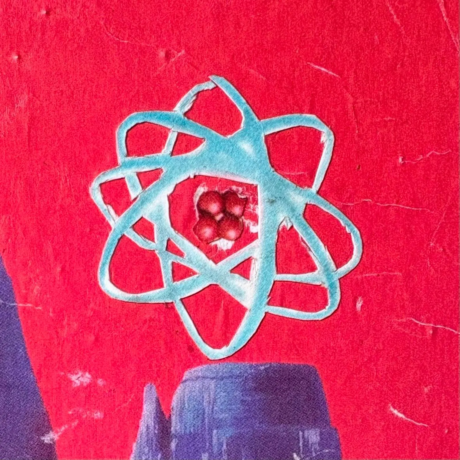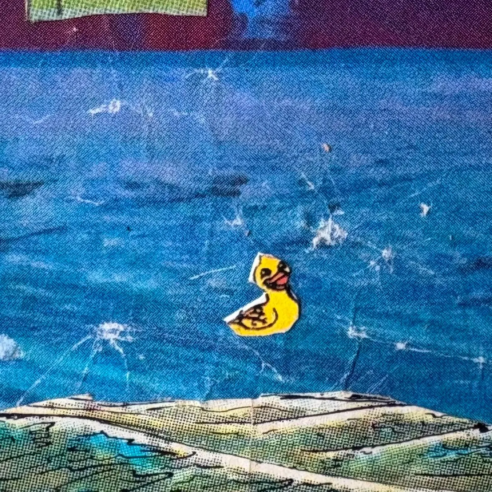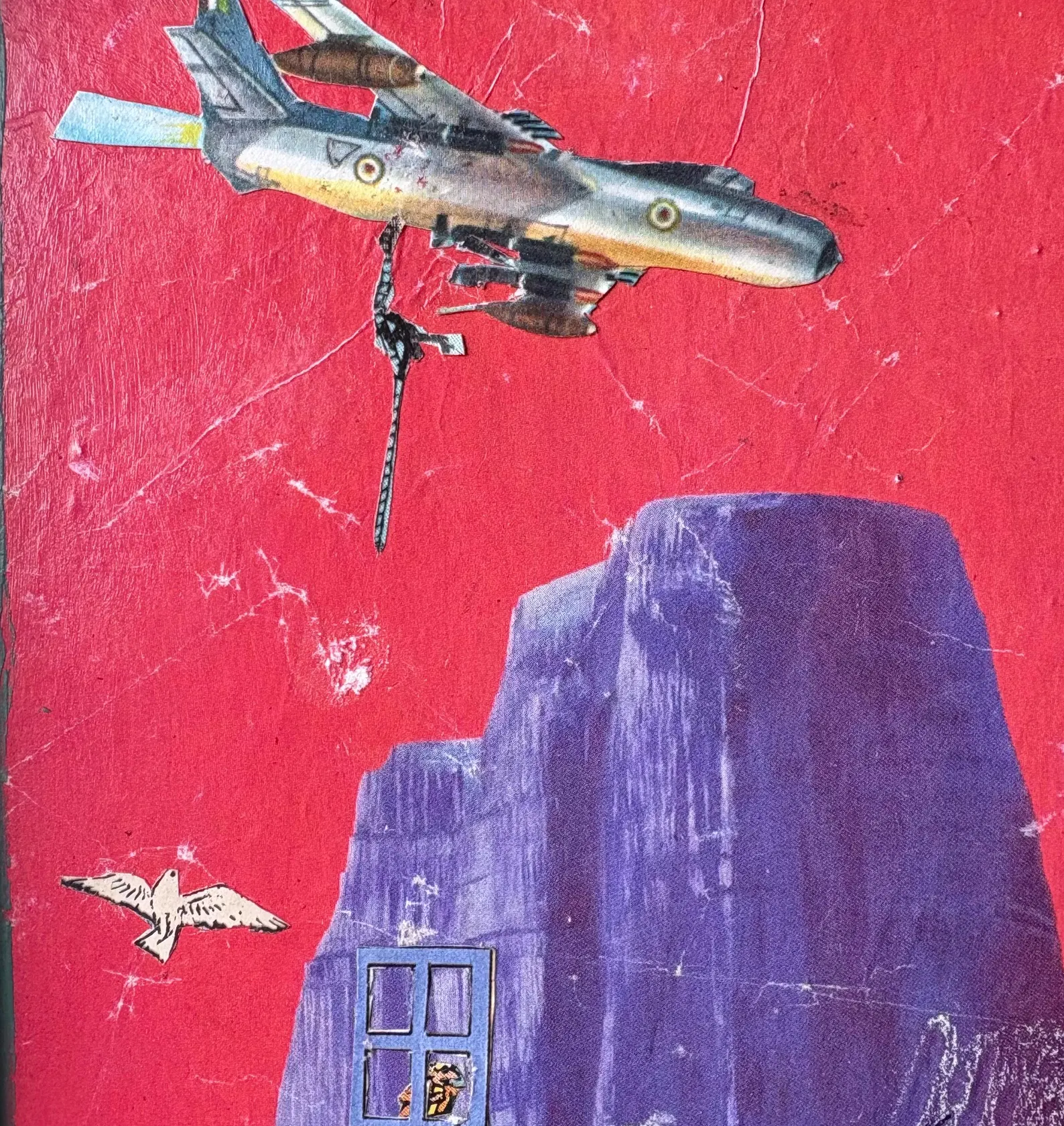 Original mixed media collage by Kim Lawson titled “Back Door Apocalypse / Paranoid Android.” Created using vintage comic and print ephemera on board. The work is framed in a vintage hardwood frame, originally handmade at Blacktown TAFE in 1984, later on it was refinished with Scandinavian oil and fitted with glass and backing. Condition: Light creases and minor wear consistent with vintage collage materials.