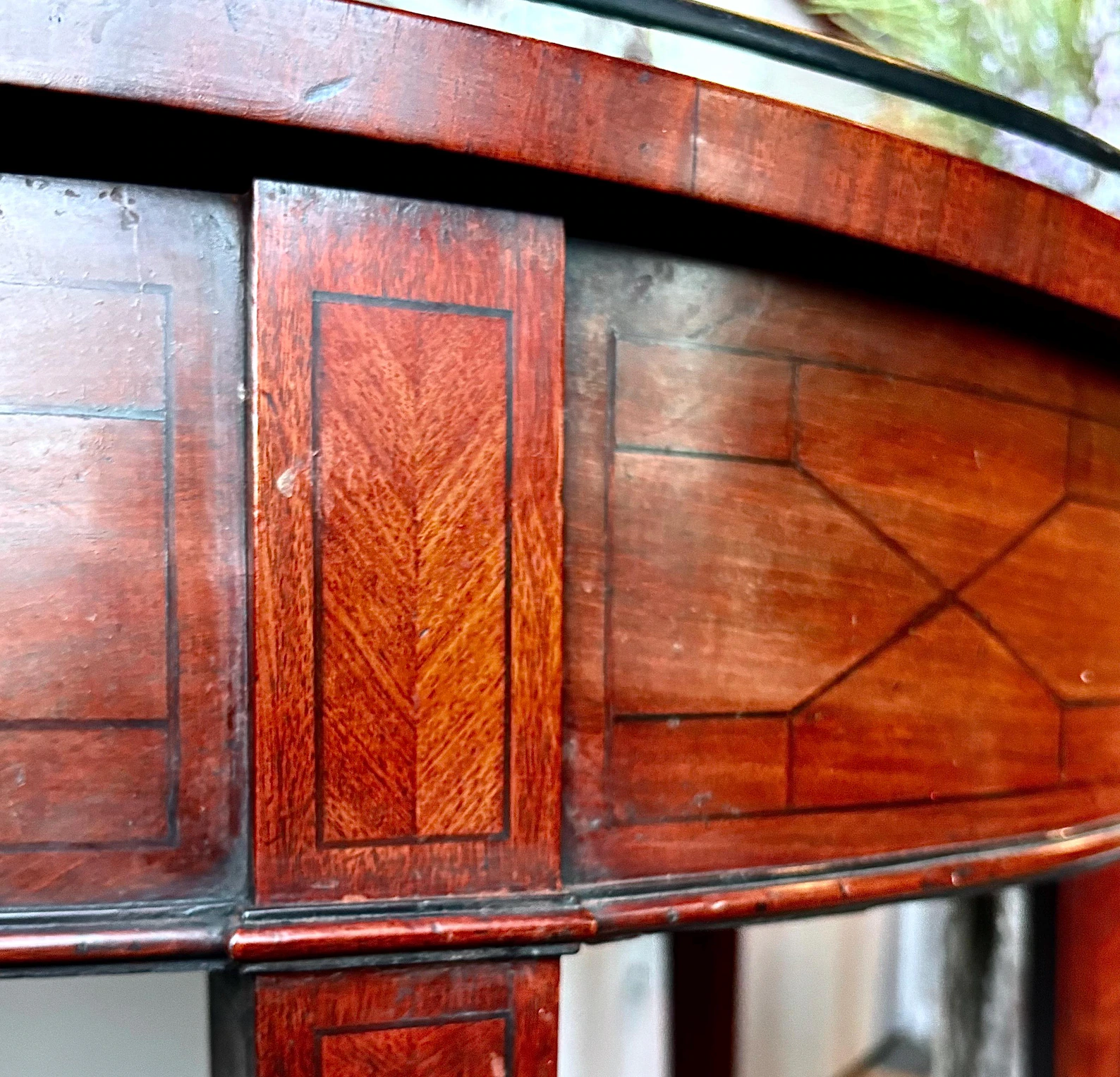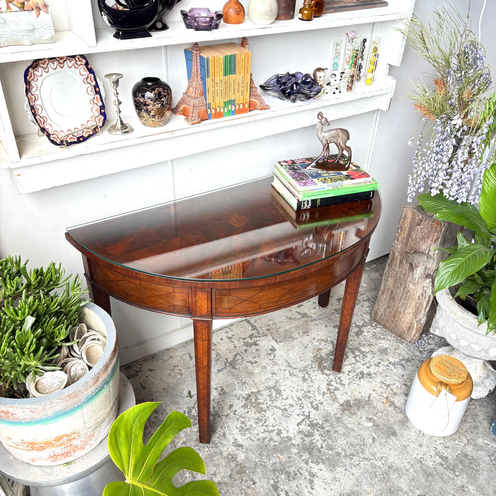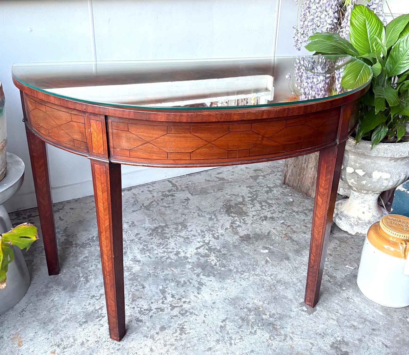 Edwardian Revival Demi-Lune Console Table with Parquetry Inlay & Glass Top
