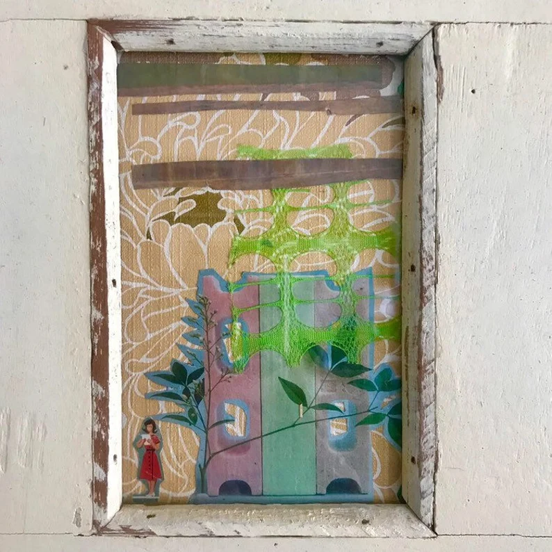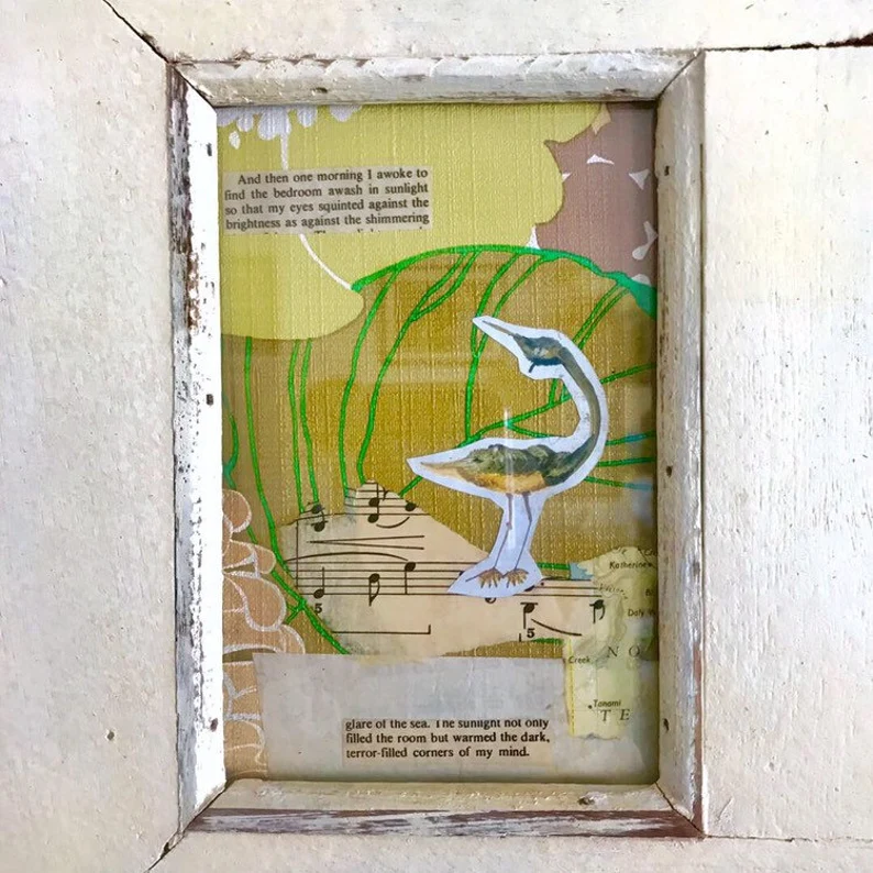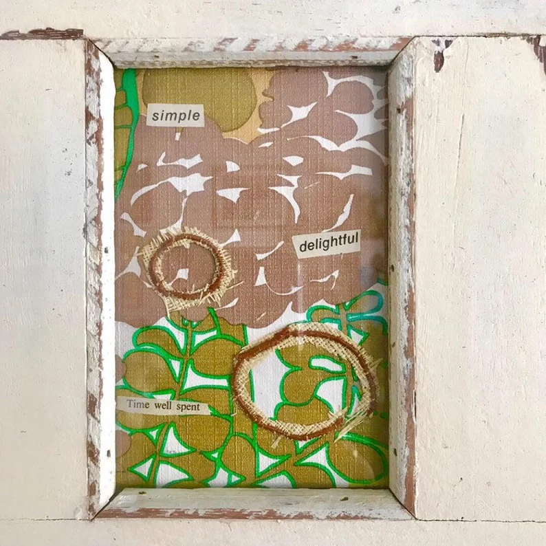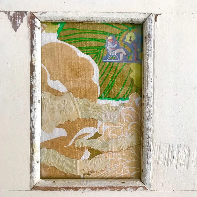 Framed art mixed media collage vintage retro and REpurposed materials. Original art 5 works in a distressed white painted rectangular frame