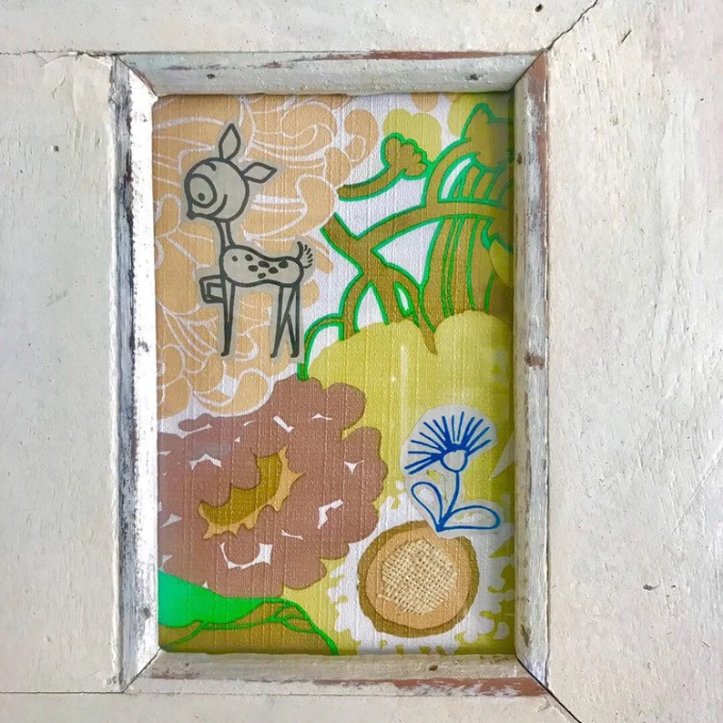 An original framed collage featuring five distinct works of art, each crafted from vintage and repurposed materials. Presented in a distressed white painted frame, this unique mixed media piece captures a retro aesthetic with a modern twist, making it a perfect conversation starter.