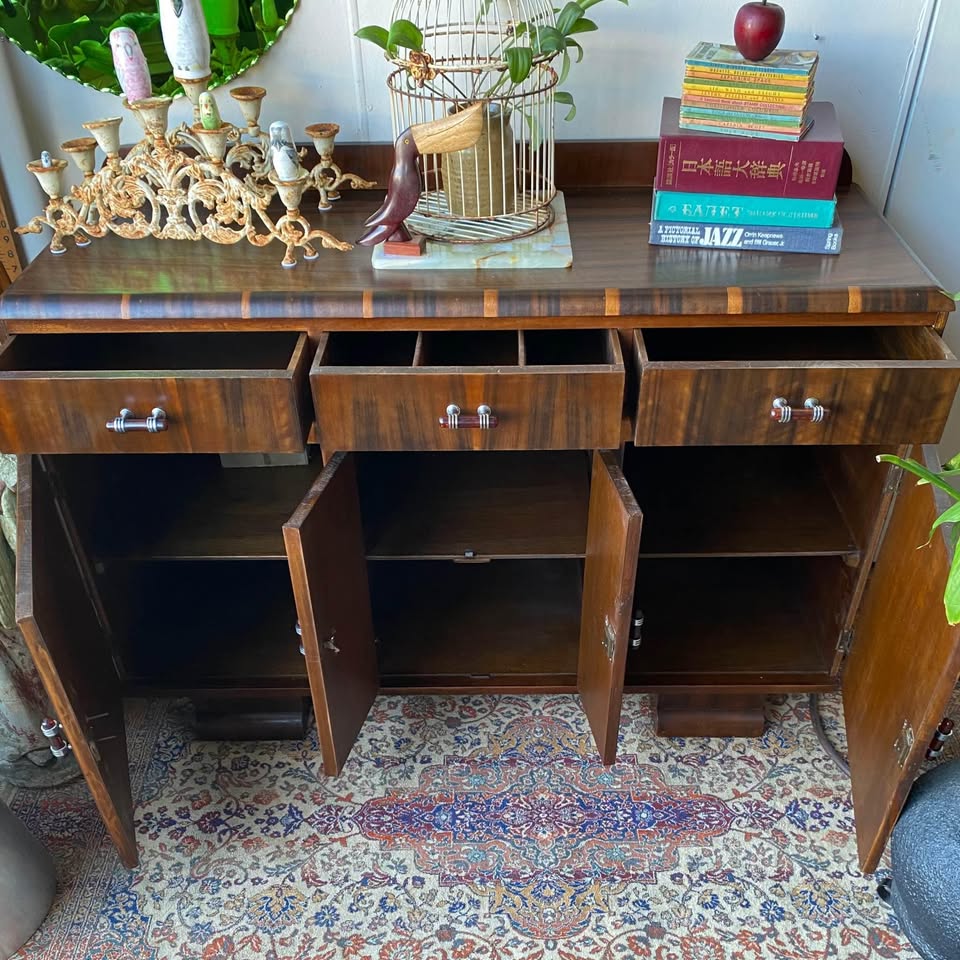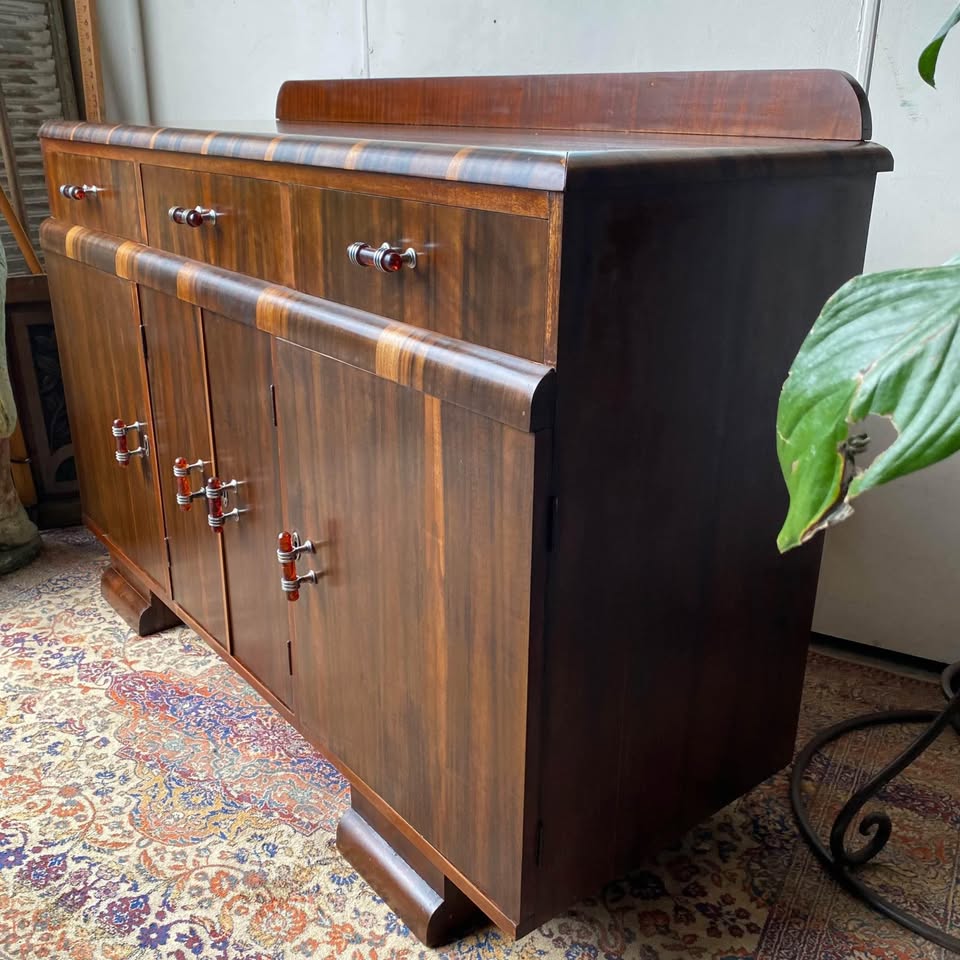 Restored Art Deco sideboard buffet in walnut veneer with original Bakelite handles. Features three cupboard spaces, including a central double-door section with working lock and original key. The three top drawers include a central cutlery divider. The piece has been fully restored and finished in Scandinavian oil. Dated “22-11-48” on the back. Overall in very good condition.