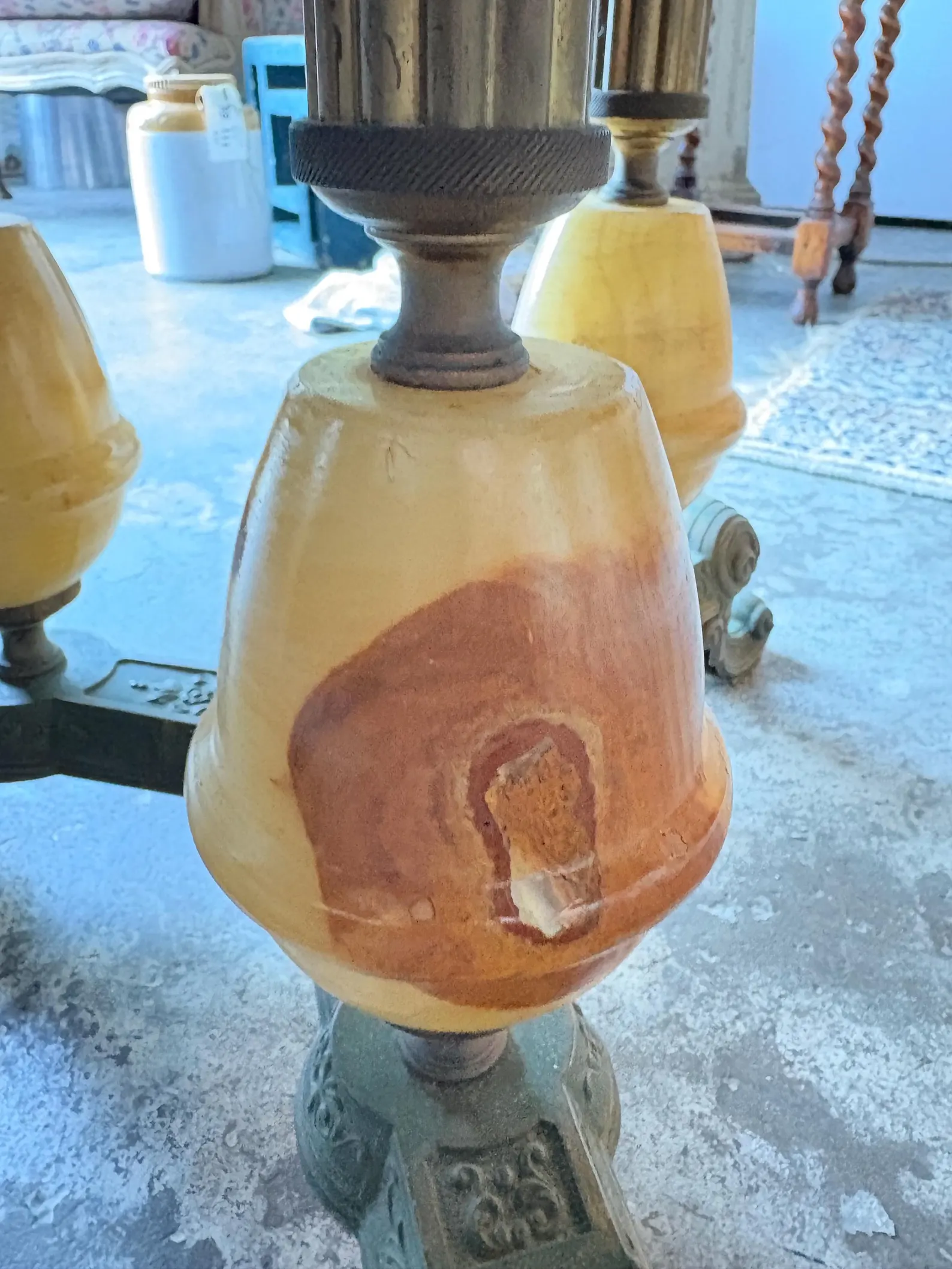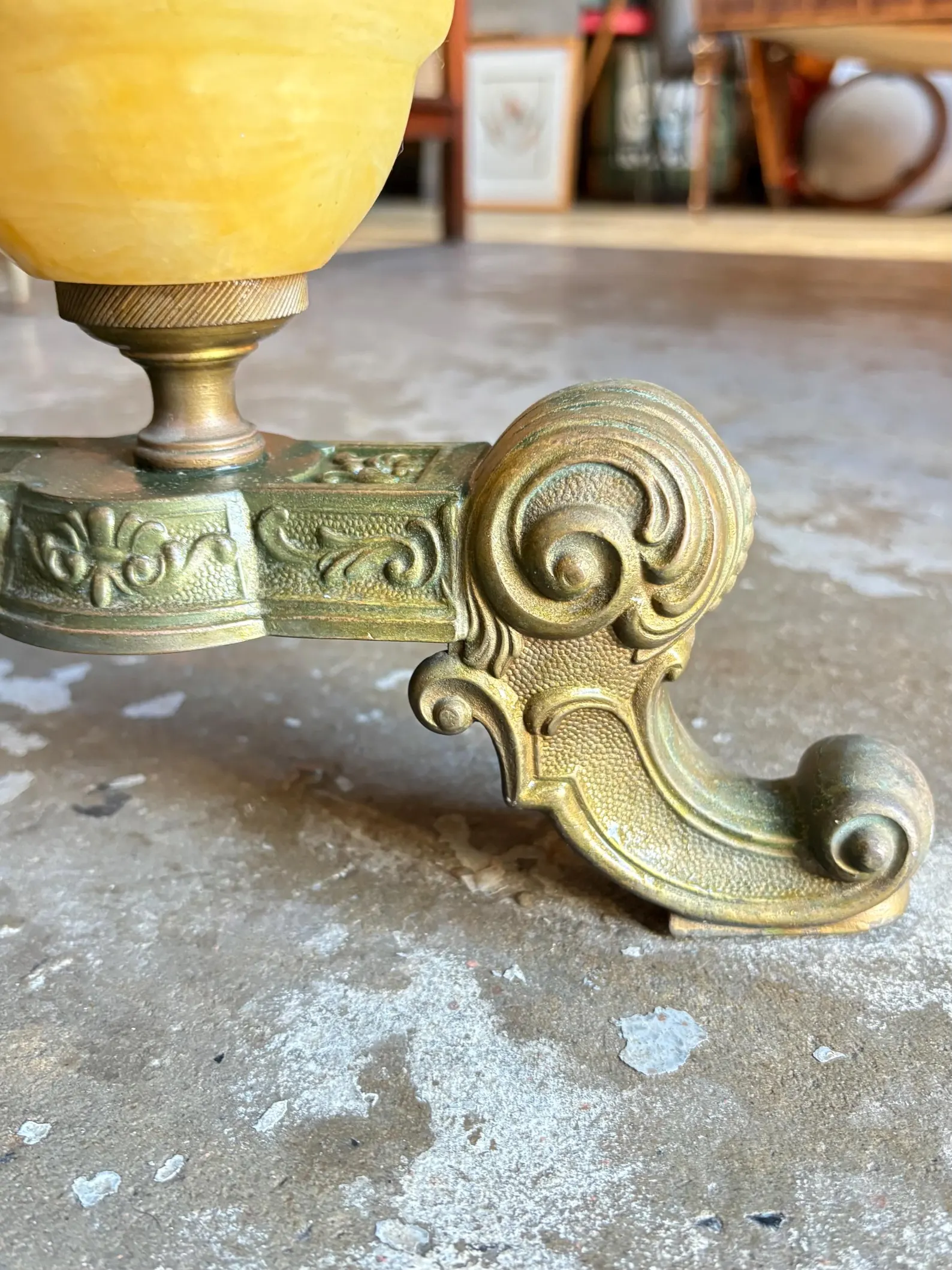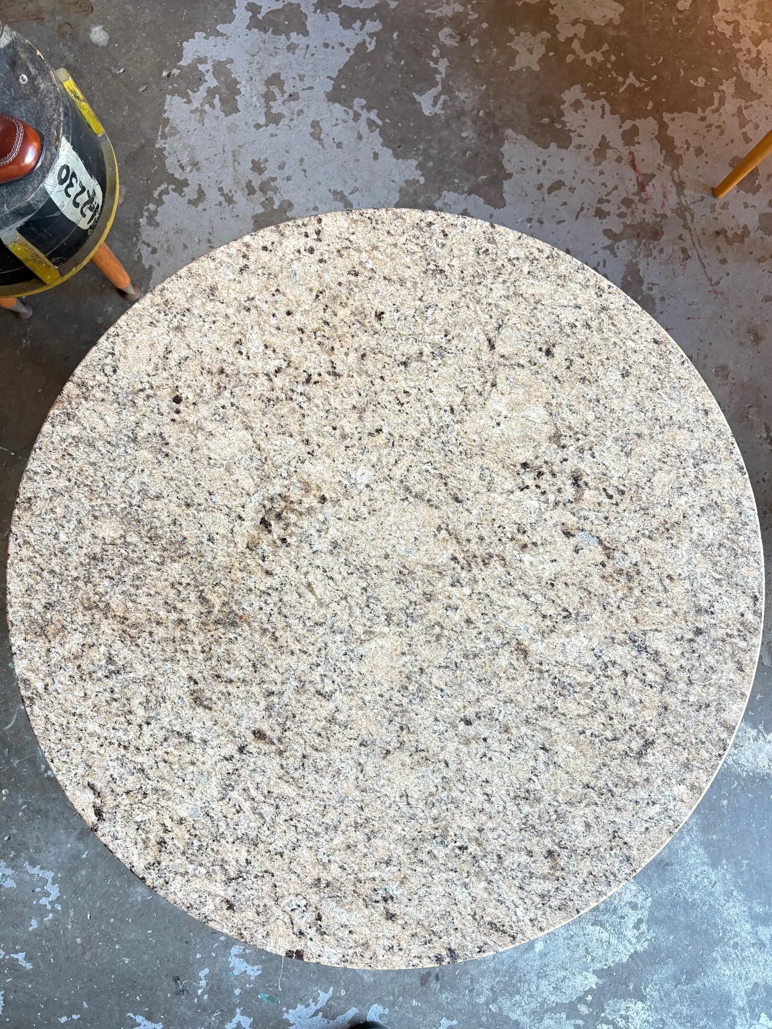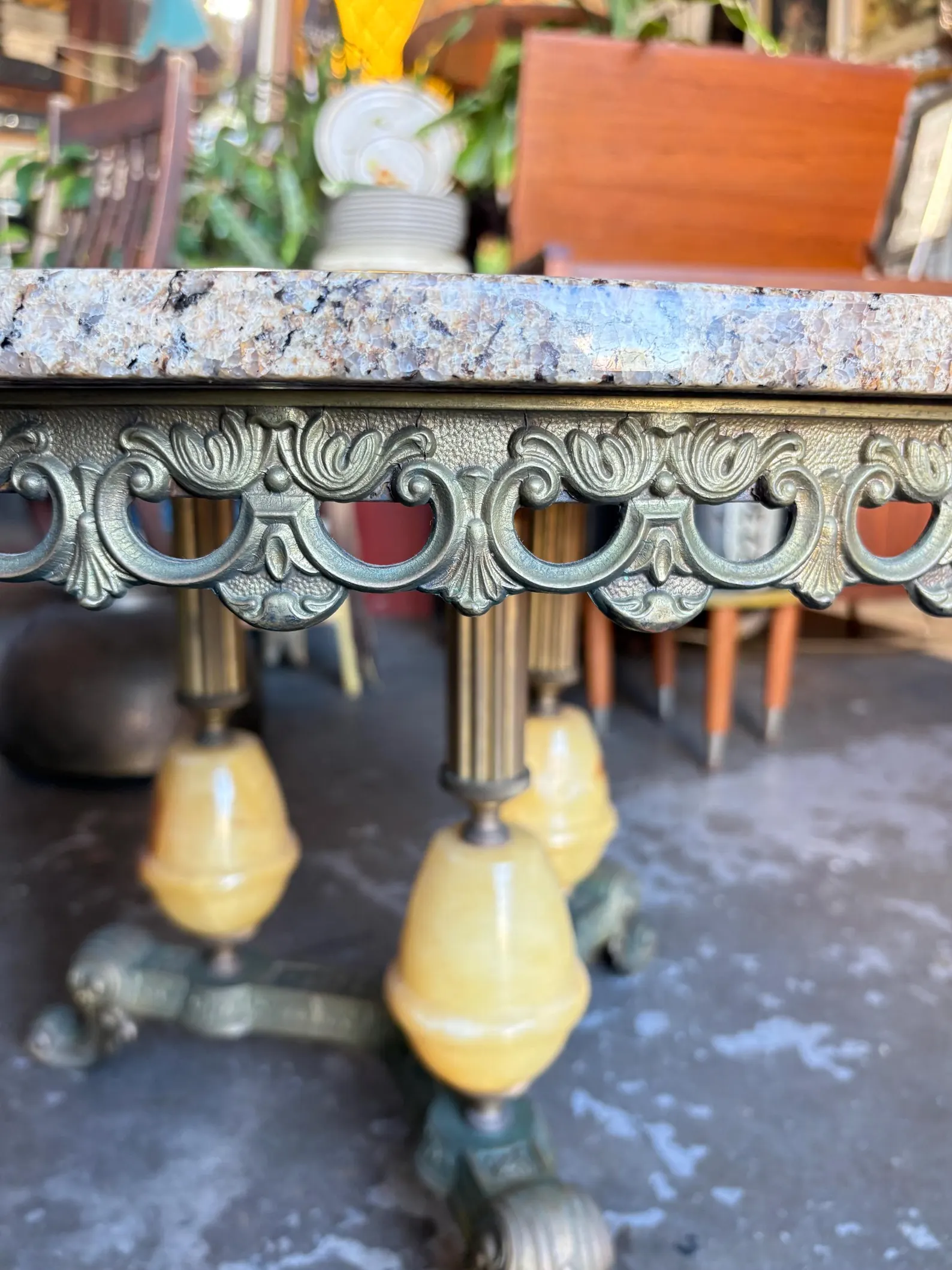 Vintage round coffee table with a polished granite top and ornate cast base. It features scalloped trim, claw-foot style supports, and alabaster accents. Mid-20th century revival style. Condition: Excellent overall, with polished granite top, intact alabaster supports, and sturdy base showing light age patina. Location: RE-lit, West Gosford. Delivery available to Central Coast, Sydney, and Newcastle.
