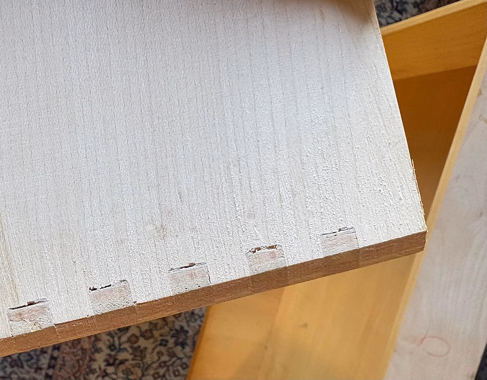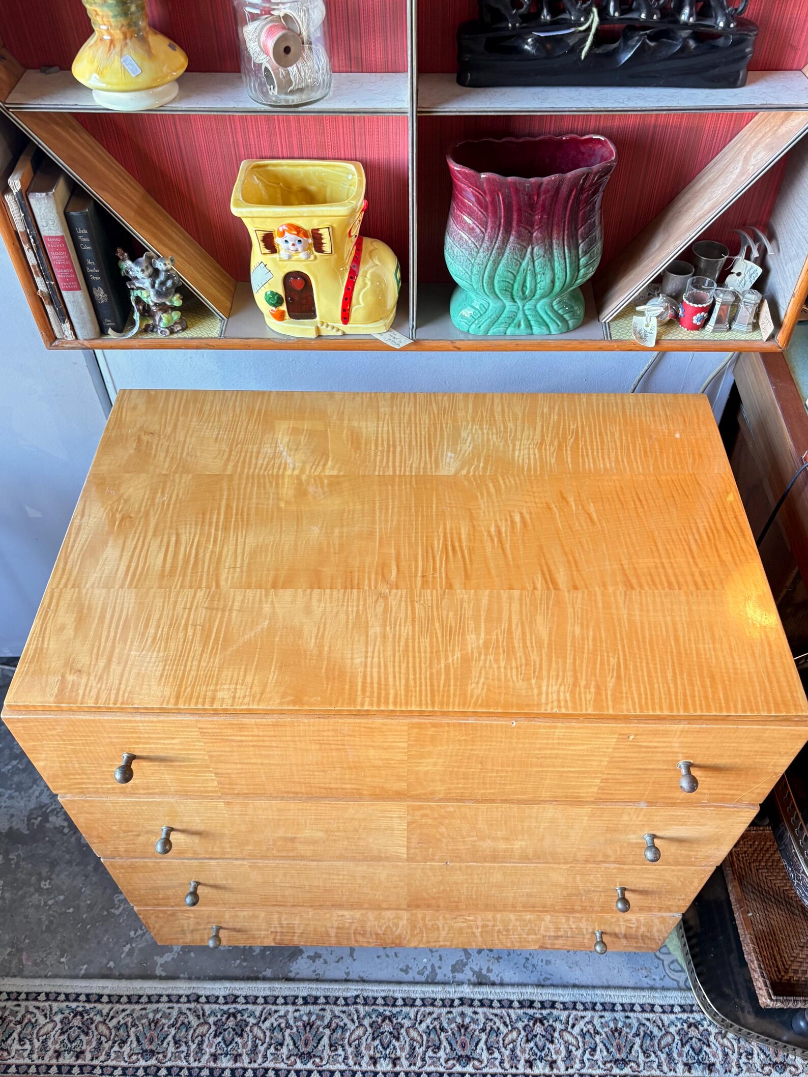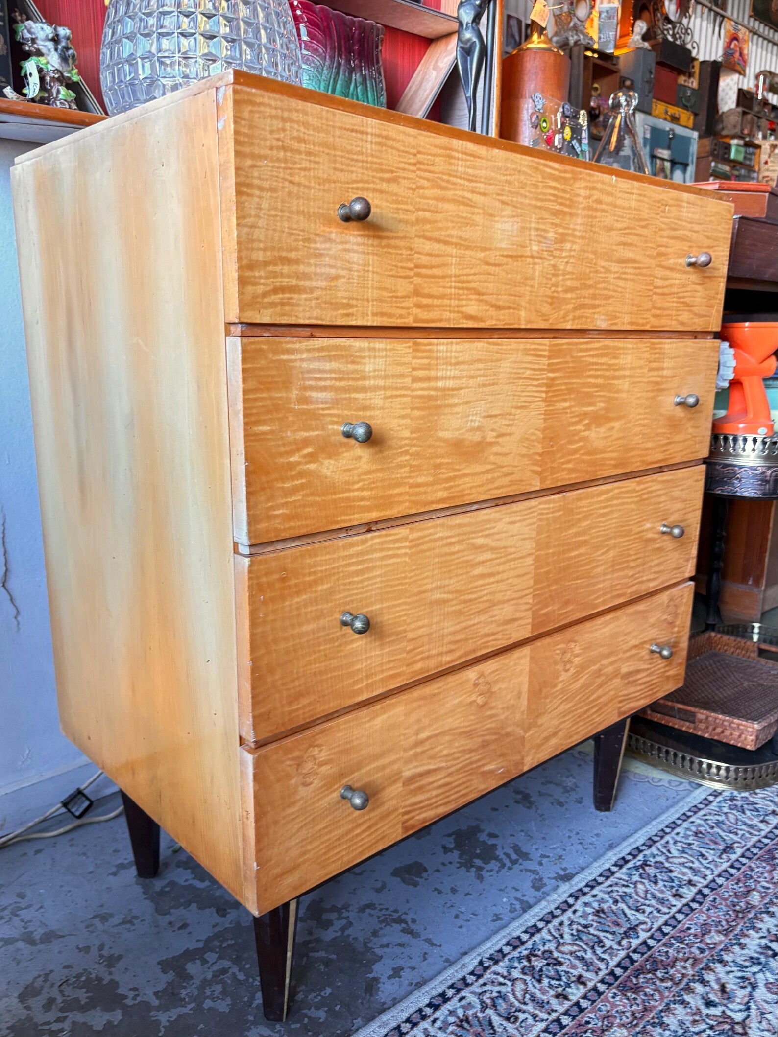 Mid-century chest of drawers by Maple Quality Furniture, featuring tiger-grain maple veneer with the original brass knobs. Built with dovetail joinery and tapered legs with contrasting inlay. Lightly restored and polished. Era: 1950s–60s. Condition: Excellent overall, with minor age-related marks.
