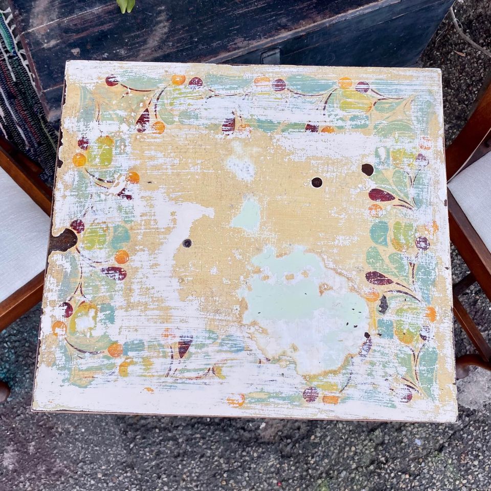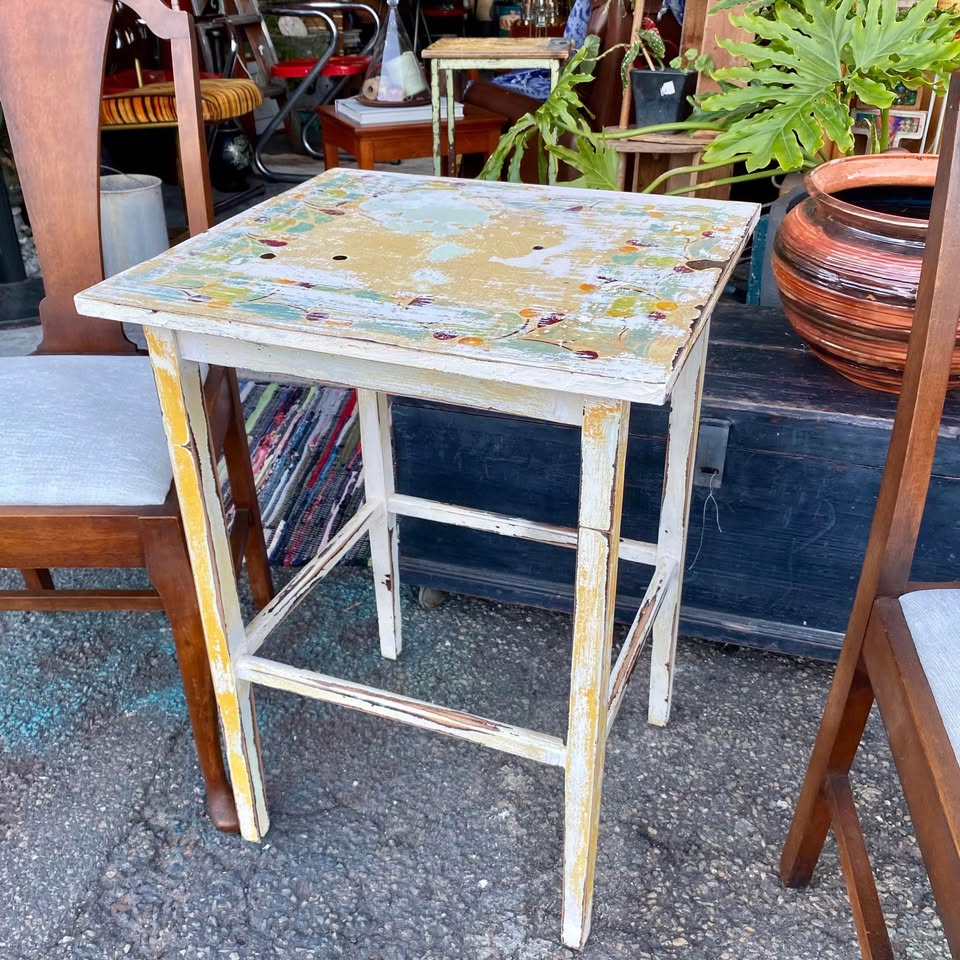 Vintage painted timber side table, suitable as a side, occasional, or end table, lamp stand, or plant stand. Features a distressed finish with a faint Art Deco-style border in yellow, blue, green, orange, and maroon visible beneath the white paint. Pick-up West Gosford; delivery available.